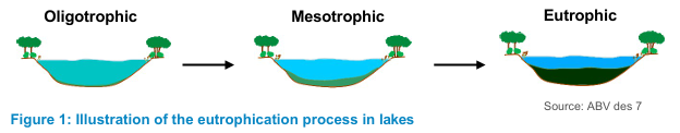 The eutrophication process modifies lake characteristics, causing sediment and organic matter build-up, reduced oxygen levels in the water, and a shift in plant species composition. This process can play out over a geological timeframe (i.e. thousands of years). It can also be accelerated by human activity including urbanization, septic system failures, recreational activities and climate change.